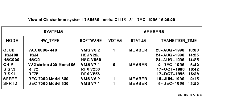 By default, the Show Cluster display includes the NODE and SOFTWARE fields of the SYSTEMS class and the STATUS field of the MEMBERS class. Figure 18-1 presents a sample customized SHOW CLUSTER display in which the HW_TYPE, VOTES, and TRANSITION_TIME fields have been added to the default SHOW CLUSTER display.